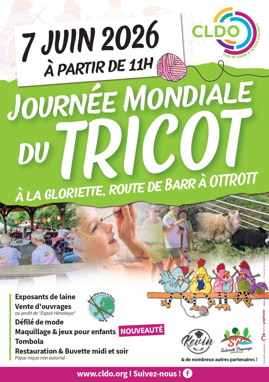 La section Tricot du Club de Loisirs et de Détente d'Ottrott vous invite le dimanche 7 juin 2026 à la journée mondiale du tricot, à partir de 11h dans le cadre reposant de la Gloriette, Route de Barr à OTTROTT.